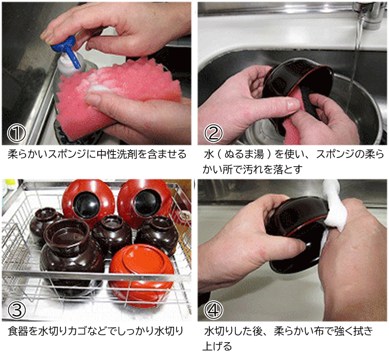 本製品は純正の輪島塗(木製品)ですので、電子レンジでの使用や食器洗浄機での洗浄、直射日光の当たる場所での保管は避けてください。また輪島塗漆器は軽く出来ていますので、片付ける際など高い所から落とさないように気を付けてください。