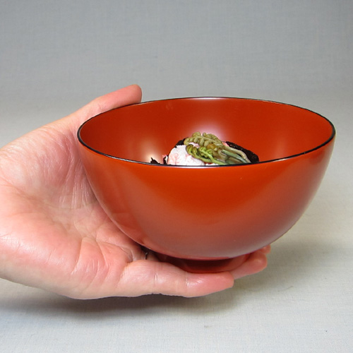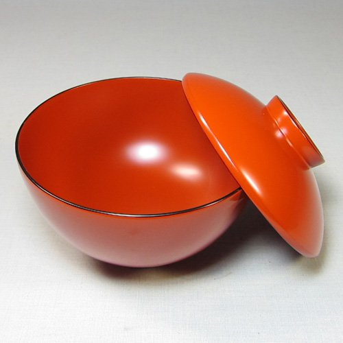 内、外ともオレンジ朱に塗上げたかわいいいお椀です。