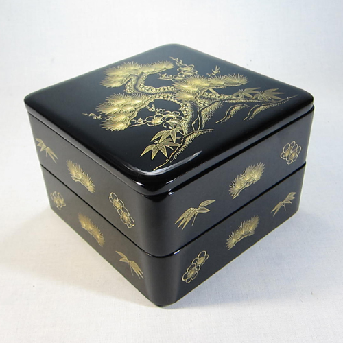 輪島塗 ヴィンテージ お重箱 二段手彫沈金 松竹梅 -黒- [艶高]